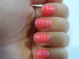But it's so hard to do. I found my varnish either drying up before I could even finish one nail or not getting tacky enough so it wouldn't go all stretchy. Nonetheless, my attempt isn't too bad! I might try again with more contrasting polishes. I went with pinks to fit in with the "sweet" type theme and picked Barry M's Dragon Fruit for a base and Model's Own Pink Punch on top.